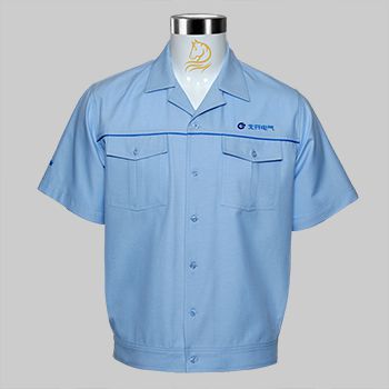 北開電氣工作服正面圖:淡藍色工作服,在炎熱的夏天能給人帶來視覺上的舒適感。夏季工作服采用翻領,使夏天剛清涼,而且提高工作服的美觀性。前胸深藍色鑲牙使工作服更有立體感。44,45,64,68,94,67,122,123,59